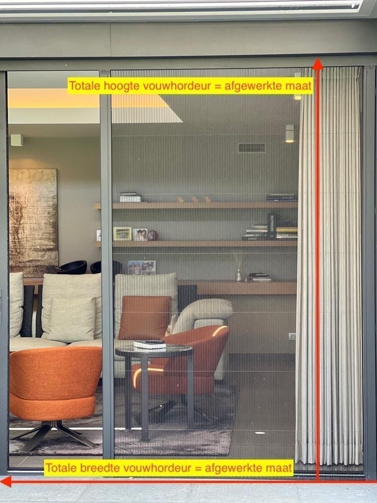 Meet de totale breedte van de vouwhordeur. Dit is eveneens de afgewerkte maat.